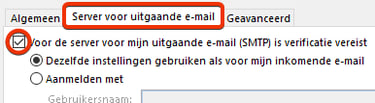 Voor Server voor uitgaande e-mail (SMTP) is ook verificatie vereist. Dit moet dus aangevinkt worden.