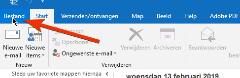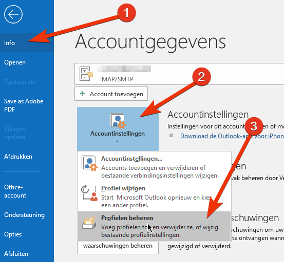 Allereerst ga je, bovenin Outlook, naar Bestand. Daar klik je op Info > Accountinstellingen > Profielen beheren.